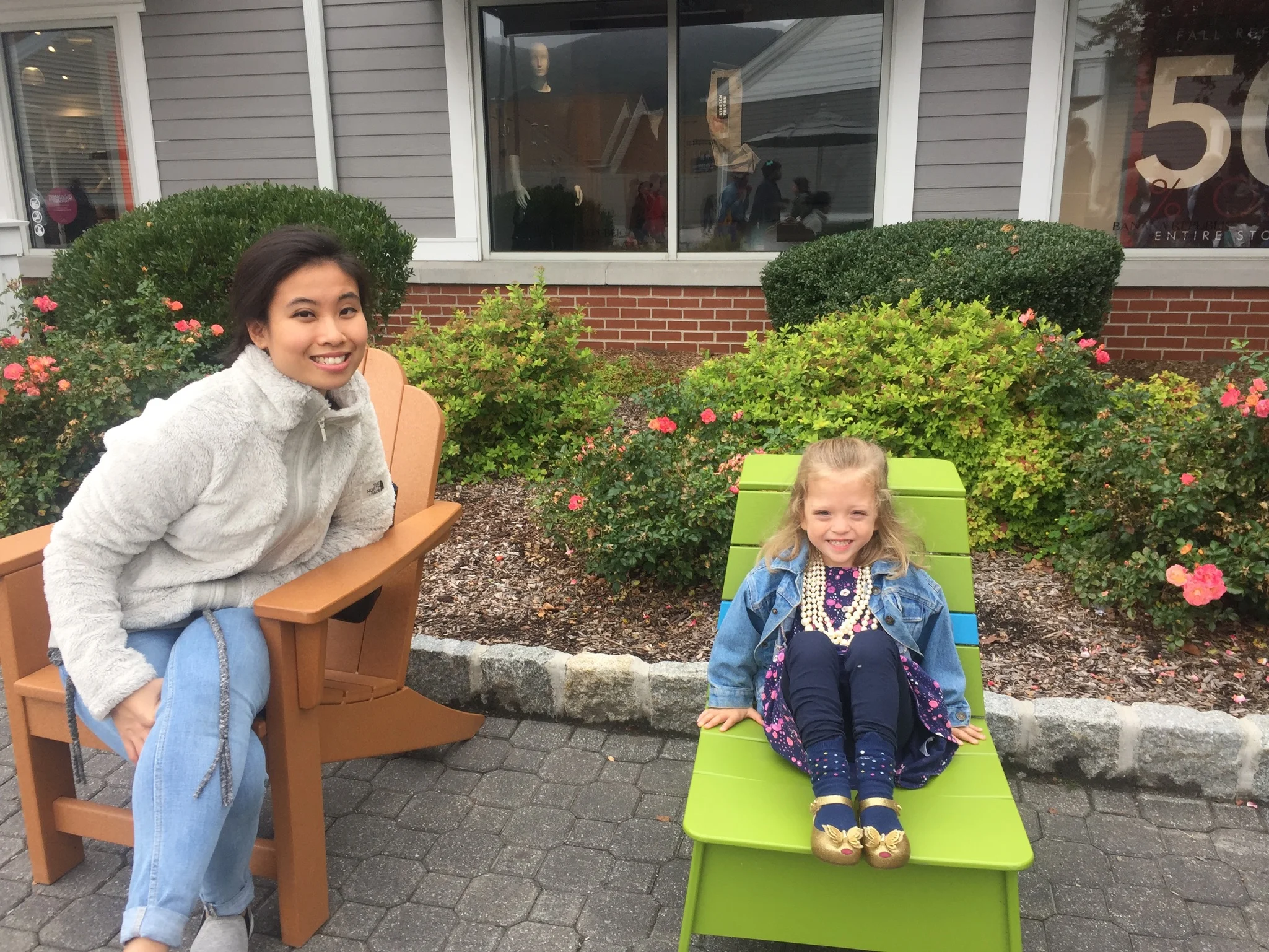 Lucie showing off some fancy pearls and her flower girl shoes. We stopped at the outlet mall on the way back to NYC and Lucie loved these green chairs.