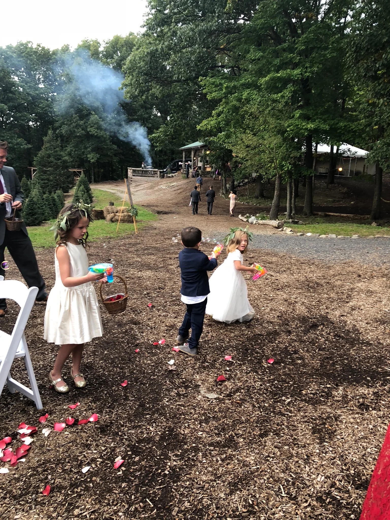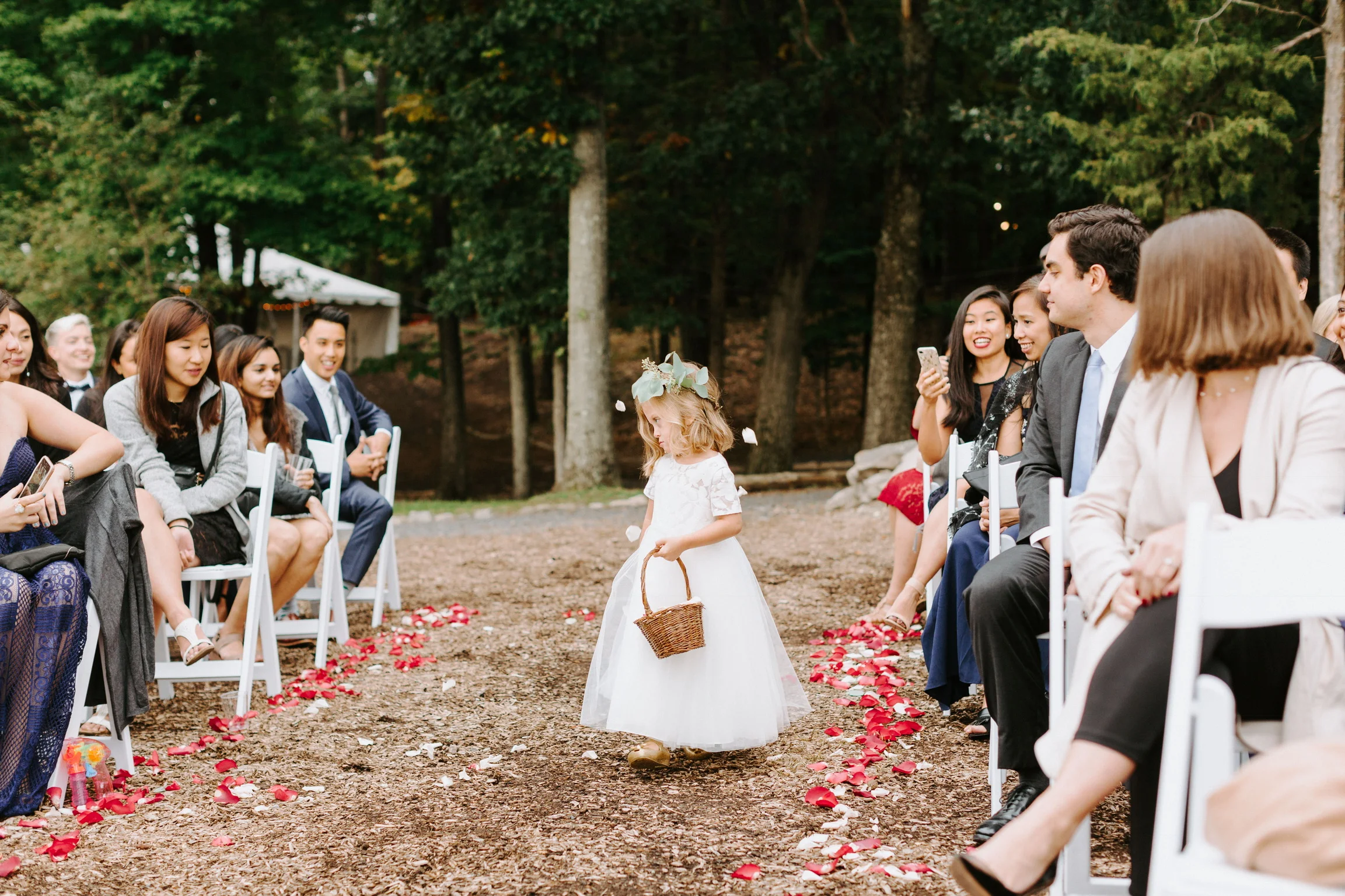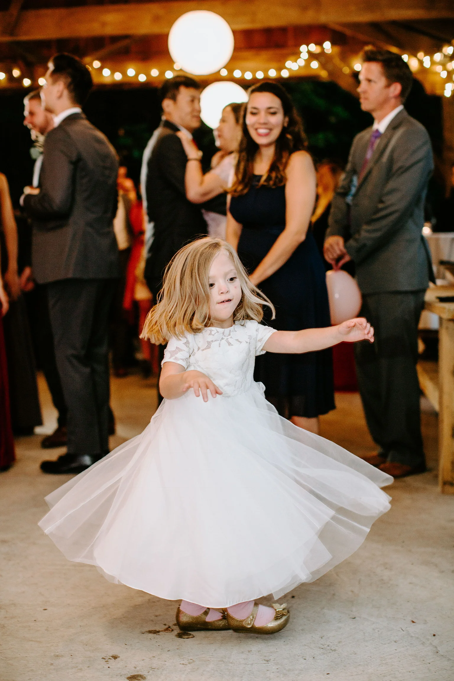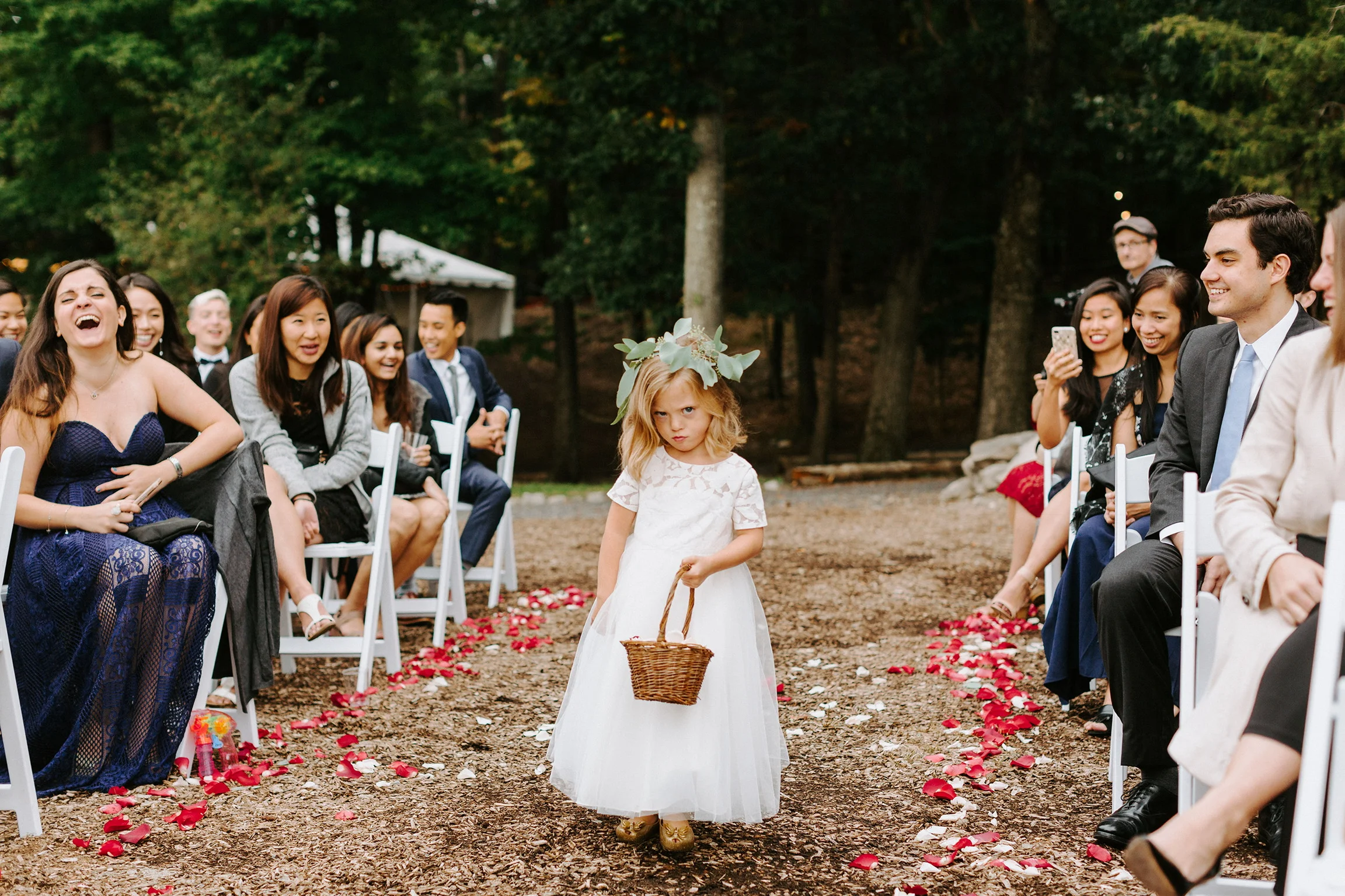 When Lucie got to the top of the aisle we watched as her face shifted from excitement to embarrassment. She got nervous from all the attention and although she didn’t cry, she didn’t smile either. This is a great shot from the photographer of Lucie begrudgingly throwing the petals over her shoulder.