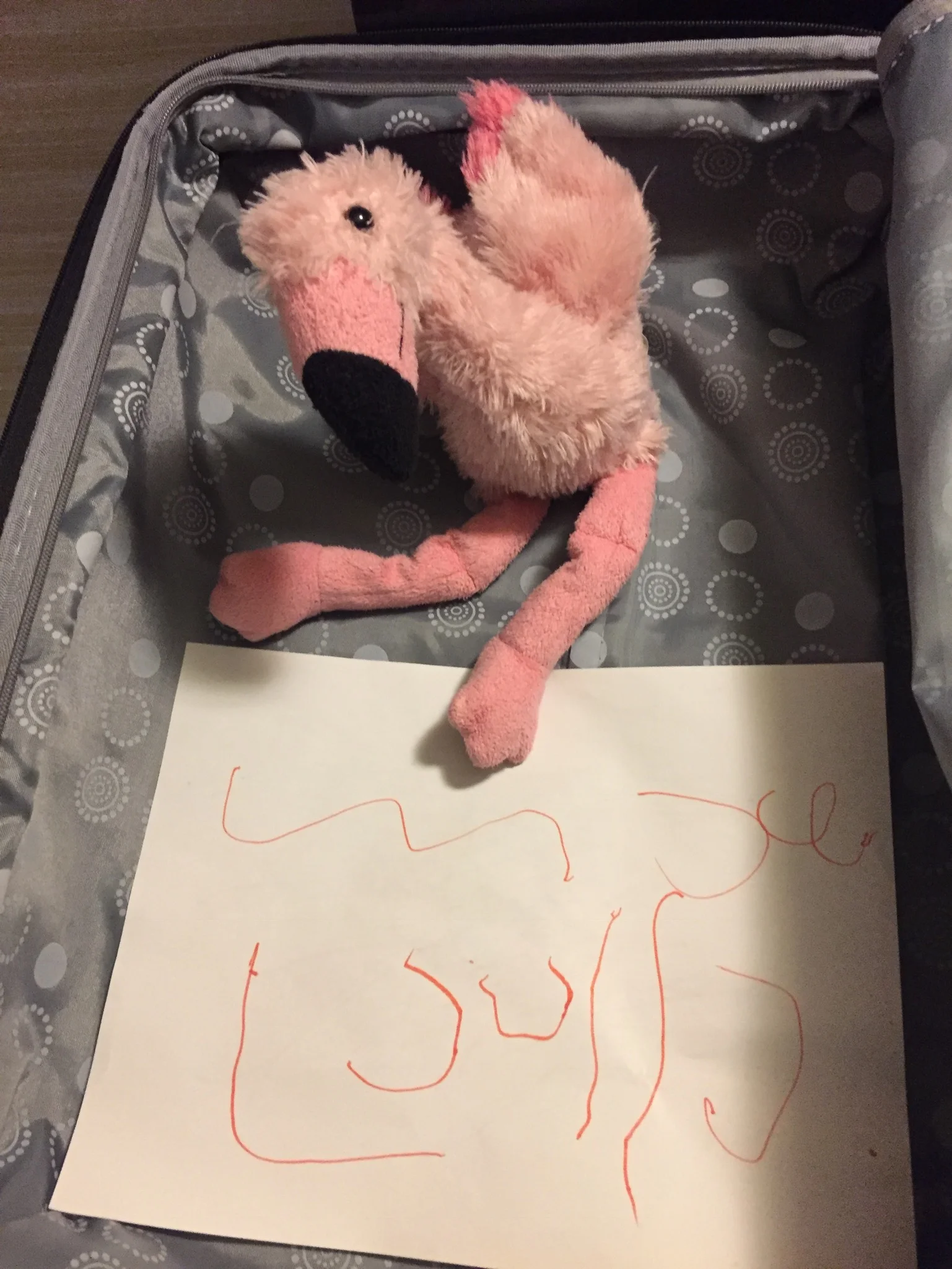 I had a quick overnight work trip in the middle of the week and Lucie let me take Felix the Flamingo with me and she wrote me a note, too. You can kind of see “mom” on the first line and “Lucille” on the bottom.